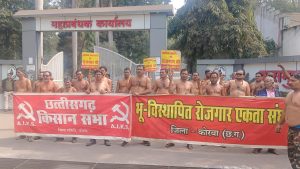 छत्तीसगढ़ किसान सभा के जिला अध्यक्ष जवाहर सिंह कंवर,दीपक साहू,सुमेंद्र सिंह ठकराल ने कहा कि पूरे देश मे आजादी के बाद से अब तक विकास परियोजना के नाम पर करोड़ों लोगों को विस्थापित किया गया है और अपने पुनर्वास और रोजगार के लिए वे आज भी भटक रहे हैं। यदि एसईसीएल ने उन्हें समय पर उसी समय रोजगार दिया होता, तो आज यह आंदोलन नहीं होता। इसलिए एसईसीएल गुमराह बनाने वाली नीति बंद करे और एसईसीएल अधिग्रहण से प्रभावित होने वाले प्रत्येक खातेदार को रोजगार देने की प्रक्रिया शुरू करे। किसान सभा के नेताओं ने कहा की विस्थापितों को सम्मानजनक जीवन और पुनर्वास प्रदान करना एसईसीएल और सरकार की जिम्मेदारी है। उन्होंने बताया कि कुसमुंडा में 791 दिनों से चल रहे आंदोलन के दबाव में ही कम जमीन, डबल अर्जन और रैखिक संबंध के मामले में एसईसीएल को नियमों में बदलाव करना पड़ा है और कुछ भूविस्थापितों को रोजगार मिलना शुरू हुआ है। अब प्रबंधन के खिलाफ अर्जन के बाद जन्म के मामले में विस्थापितों के पक्ष में फैसला देने के लिए संघर्ष और तेज किया जाएगा। भूविस्थापित नेताओं रेशम यादव, दामोदर श्याम, रघु यादव और जय कौशिक भी सभा को संबोधित करते हुए कहा कि जमीन अधिग्रहण करके उनकी आजीविका का एकमात्र साधन खेती छीन लिया गया है, इसके कारण विस्थापित किसानों की आर्थिक स्थिति भी काफी खराब है। एसईसीएल रोजगार देने के वायदे पर अमल नहीं कर रहा है। इसलिए जब पूरी दुनिया नए साल का जश्न मना रही है, तब कुसमुंडा के भू-विस्थापित किसान अपनी दयनीय स्थिति को दिखाने और भूविस्थापित किसानों को बर्बाद करने वाली नीतियों के खिलाफ अर्धनग्न होकर विरोध प्रदर्शन करने के लिए मजबूर हैं। आज किसानों के पास केंद्र और राज्य सरकार तथा एसईसीएल की रोजगार विरोधी नीतियों के खिलाफ संघर्ष के अलावा और कोई रास्ता नहीं बचा है। विरोध प्रदर्शन में प्रमुख रूप से बृजमोहन, मोहन यादव,दीनानाथ,नरेंद्र यादव,उत्तम दास,चंद्रशेखर, फिरत, कृष्णा,होरी, गणेश बिंझवार,अनिल बिंझवार, हरि, विजय, आनद,फणीन्द, हरिहर,अनिरुद्ध,संजय यादव,अमरजीत,हेमलाल,बजरंग सोनी,जितेंद्र के साथ बड़ी संख्या में भूविस्थापित उपस्थित थे।