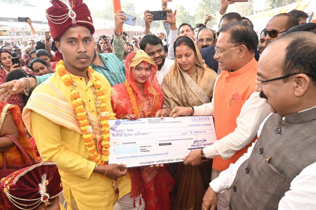 मुख्यमंत्री श्री विष्णुदेव साय सामूहिक विवाह सम्मेलन में शामिल हुए। इस दौरान उन्होंने नव दंपत्ति को आशीर्वाद देकर उनके सुखद भविष्य की शुभकामनाएं दी। मुख्यमंत्री ने नव विवाहित नीलू कुमारी और ममता केवट को विवाह प्रोत्साहन राशि के 35-35 हजार रुपए की राशि का चेक प्रदान किया।
