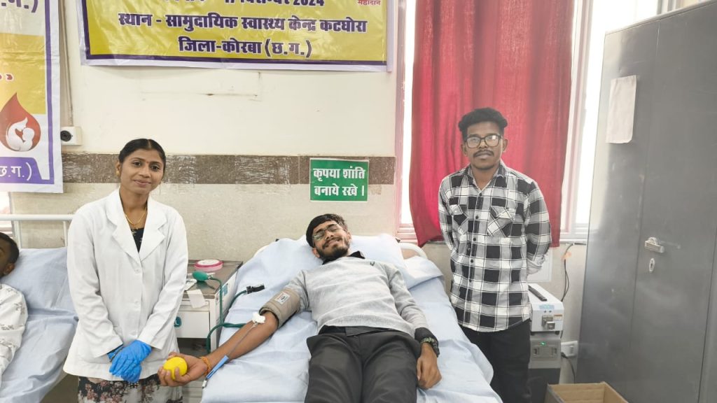 कोरबा- कटघोरा (शिव शंकर जायसवाल )। कृषि महाविद्यालय का अनुसंधान केंद्र कटघोरा कोरबा के राष्ट्रीय सेवा योजना इकाई के द्वारा कृषि तकनीकी प्रचार प्रसार तथा राष्ट्रीय दिवसों एवं विभिन्न क्रियाकलापों के माध्यम से सामाजिक जागरूकता लाने का प्रयास किया जाता रहा है इसी कड़ी में सामुदायिक चिकित्सालय विकासखंड कटघोरा के चिकित्सा अधिकारी डॉ रंजना तिर्की के आग्रह पर डॉ एसएस पोर्ते अधिष्ठाता कृषि महाविद्यालय के निर्देश तथा इंदिरा गांधी कृषि विश्वविद्यालय के सतत सहयोग से 17 दिसंबर को राष्ट्रीय सेवा योजना इकाई के स्वयंसेवको के द्वारा रक्तदान किया गया ।