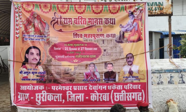 27 दिसंबर तक चलने वाली कथा आज तारीख से रामेश्वरम में परमेश्वर देवांगन सपत्नीक (श्रीमती ललिता) देवांगन , कीर्तन देवांगन उनकी माता मंगली बाई देवांगन के आशीर्वाद से एवं उनके समस्त भाईयो के सौजन्य से छुरी कोरबा निवासी द्वारा 21दिसंबर दिन सोमवार से प्रारंभ हो गया है। जिसमें काफी संख्या में लोग उपस्थित है।