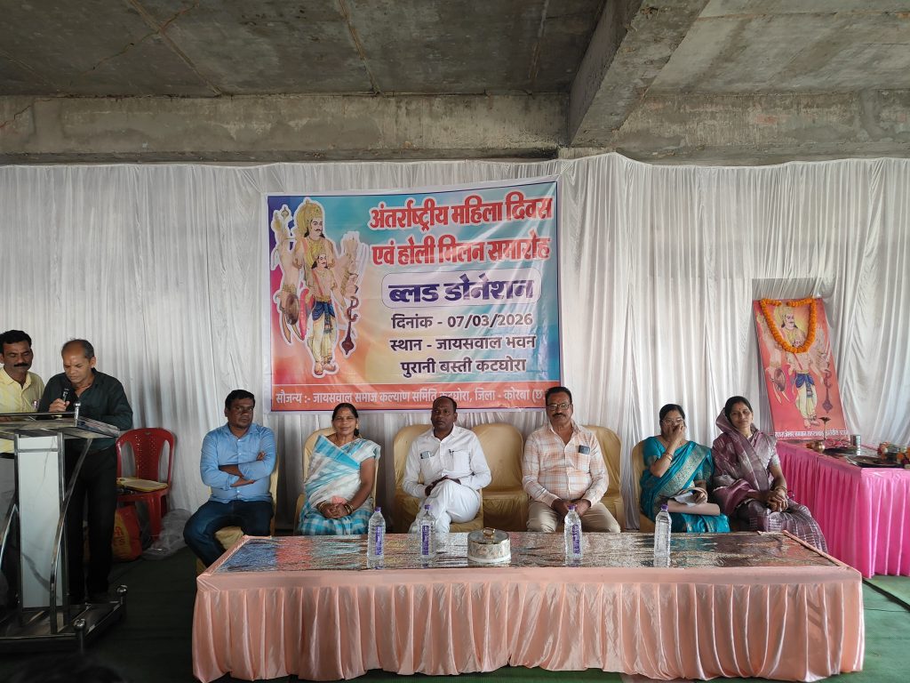 कटघोरा (सत्यम जायसवाल )जायसवाल समाज कल्याण समिति द्वारा जायसवाल भवन पुरानी बस्ती में अंतर्राष्ट्रीय महिला दिवस होली मिलन एवं ब्लड डोनेशन कार्यक्रम संपन्न हुआ ।कार्यक्रम के मुख्य अभ्यागत के रूप में माननीय प्रेमचंद पटेल विधायक कटघोरा , विशिष्ट अतिथि के रूप में डॉ शकुंतला जायसवाल – जिलाध्यक्ष जायसवाल महिला समाज, डॉ राजेंद्र जायसवाल – जिलाध्यक्ष जयसवाल समाज कल्याण समिति,